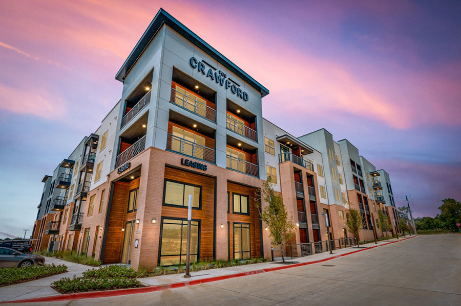 The Crawford is a four-story, Class “A” community, located in Fort Worth, TX. Strategically located in the East Fort Worth submarket just west of Hwy-360, The Crawford’s location places residents within short distance of some of the city’s largest employment hubs, retail centers, and entertainment destinations including American Airlines, DFW International Airport, and Bell Helicopter. The Crawford has amenities that will include a resort-style pool & outdoor cooking area, 4th story rooftop lounge, state-of-the-art fitness center, golf simulator, dog park, business center, conference room, clubhouse, automated package room, security cameras, and controlled access gates. The high-end amenities continue into the units with stainless steel appliances, ceramic backsplashes, quartz countertops, walk-in closets, and private yards. The Crawford will begin leasing in late 2024.